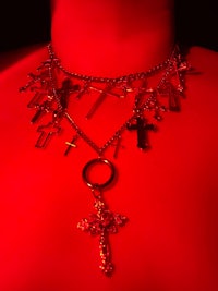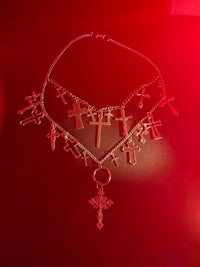 Stainless steel chains and cross pendants cover your neck and decalotage. One mini o-ring is used in the middle for the biggest cross.
